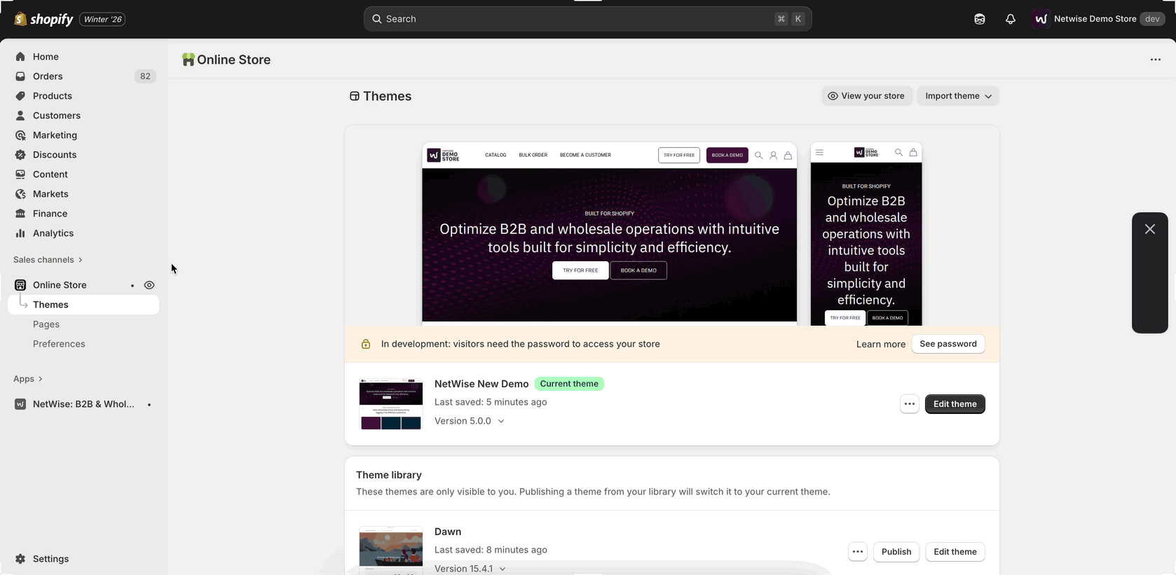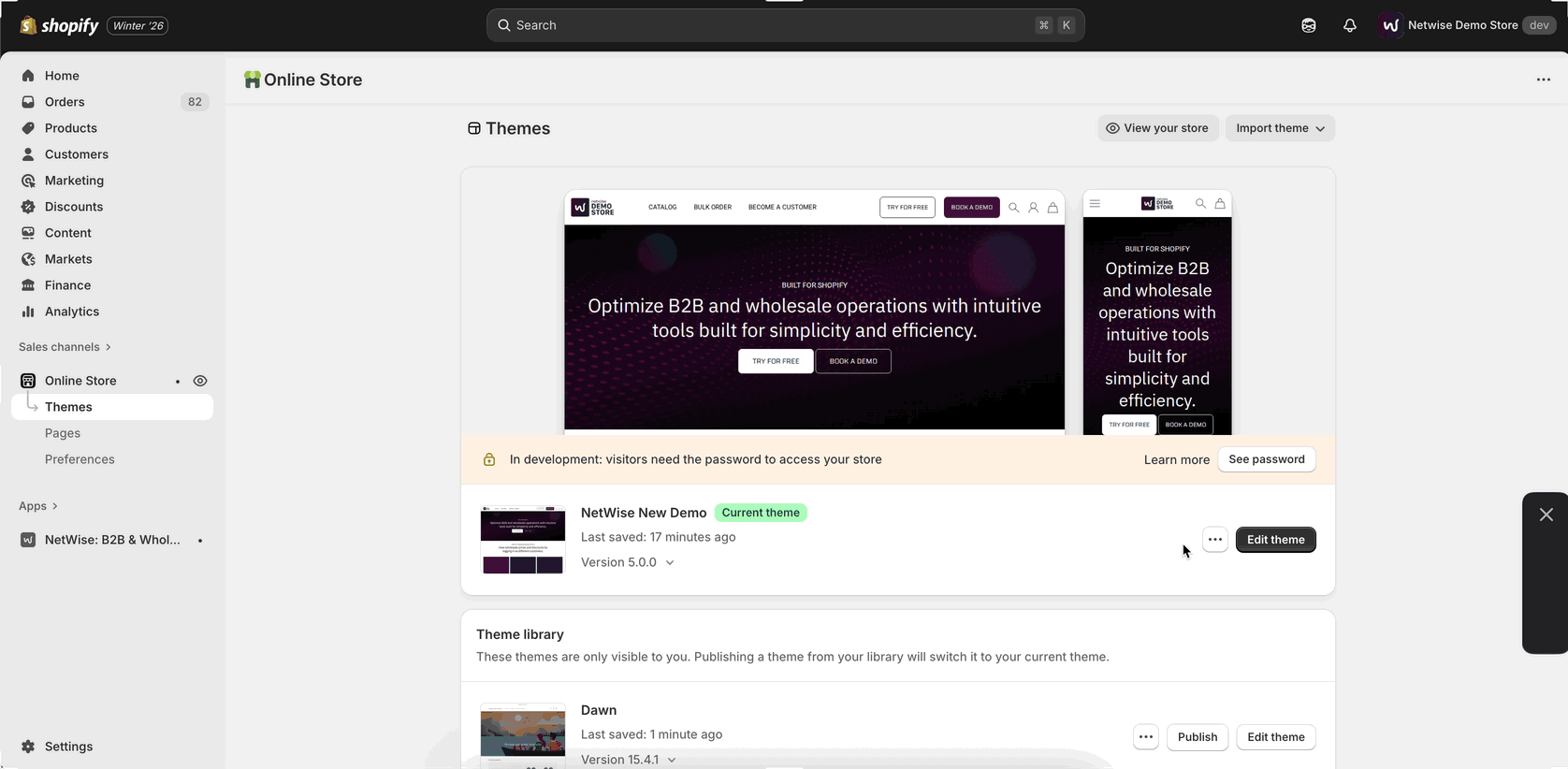 - Locate NetWise: Theme Extension, select the relevant theme from the dropdown, enable the app embed, and save the changes.