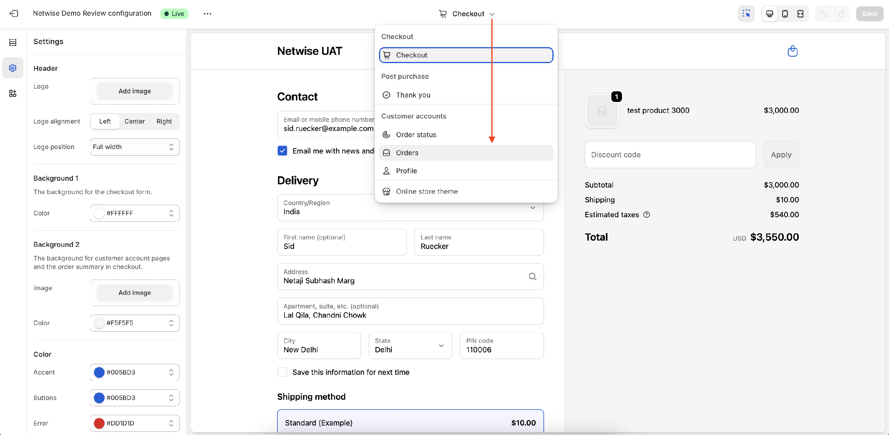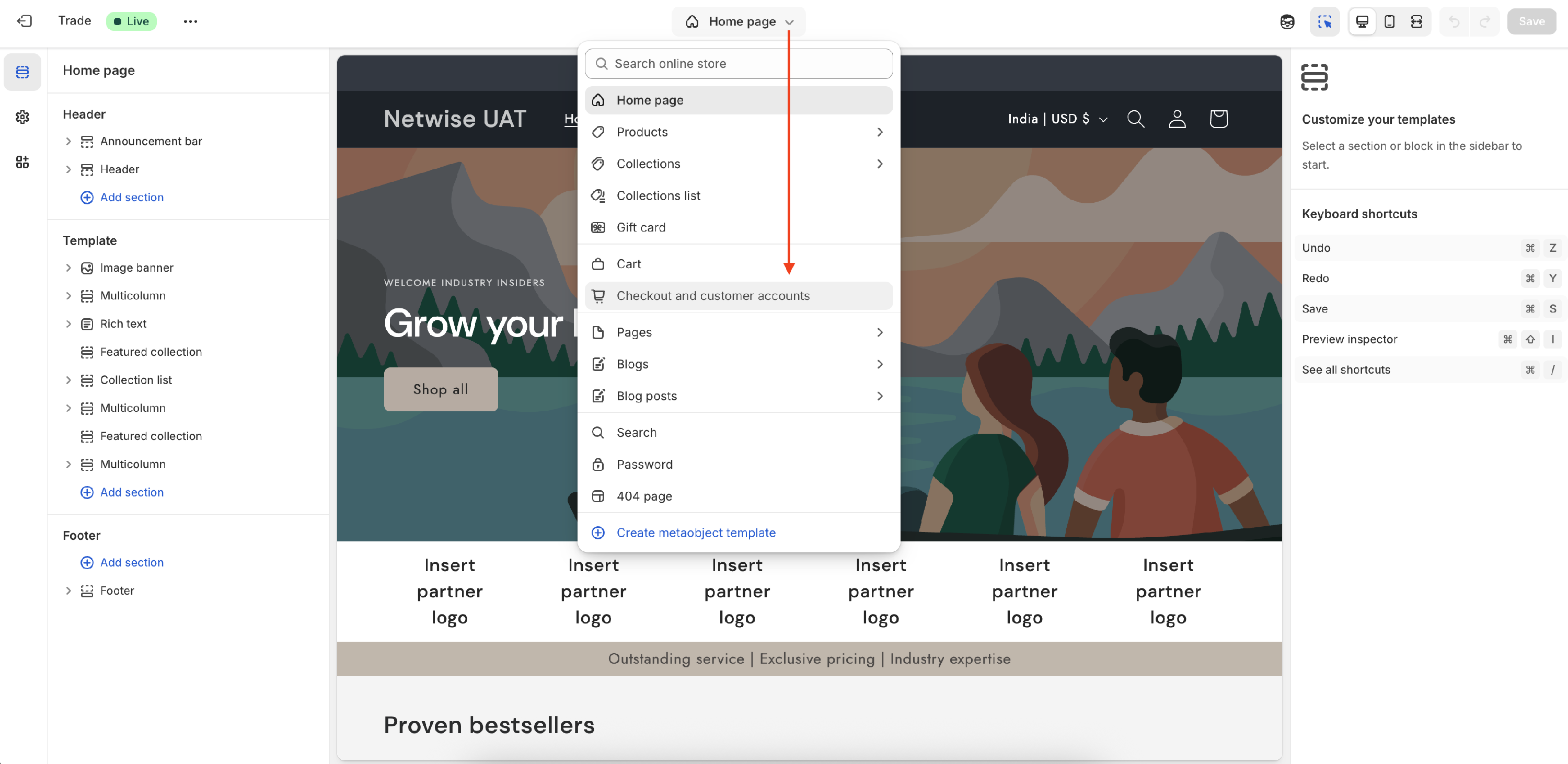 - At the top center dropdown, select Checkout and Customer Accounts